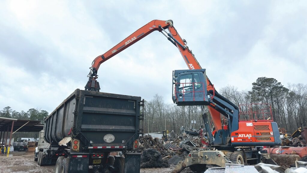 The steady flow of scrap through the Locust Grove yard depends heavily on equipment to ensure efficient material handling keeps trucks moving, piles organized and shredders supplied with a constant stream of metal. At the center of the operation are two Atlas 270MH wheeled material handlers purchased from local dealer Cowin Equipment Company Inc. with the help of Brian Hagood and Will Bice.
